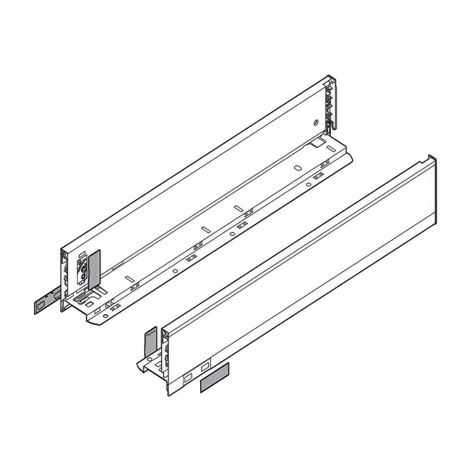 Blum 770M5502S Legrabox Pure M çekmece yanı, yüksek dayanıklılığı ve çarpıcı tasarımıyla dikkat çeken, geniş hacimli çekmeceler için ideal bir tercihtir. 550 mm uzunluk ve M yükseklik (90,50 mm) ölçüsüne sahip bu set, sağ ve sol çekmece yanları olarak sunulur. Güçlü görünümüyle öne çıkan karbon siyah kaplama, modern ve endüstriyel tasarımlarla mükemmel uyum sağlar. Gövdesi, maksimum sağlamlık sunan çelik malzemeden üretilmiştir. Düz tasarım çizgileri, minimal ve şık mobilya yapılarının tamamlayıcısıdır. Ön sabitleme braketi, panel montajını hızlı ve güvenli kılar. Klipsli arka bağlantı, çelik ya da ahşap arka panellerle entegre çalışır. 539,8 mm iç çekmece uzunluğu, geniş ve verimli kullanım alanı sağlar. 17 mm montaj ölçüsü, 16 mm taban kalınlığı ve yükseklik ayarı ile kolay montaj ve hassas hizalama mümkündür. Hem görsel hem teknik açıdan güçlü bir çözümdür.