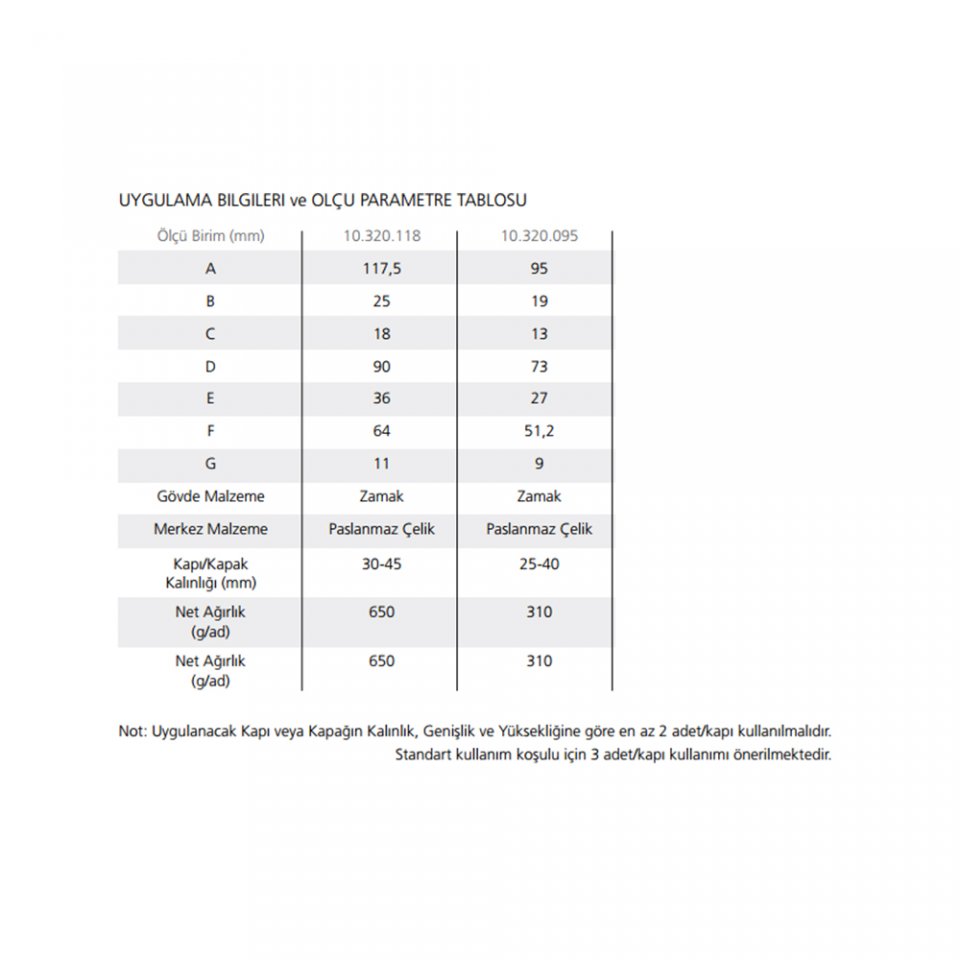 - Not: Uygulanacak Kapı veya Kapağın Kalınlık, Genişlik ve Yüksekliğine göre en az 2 adet/kapı kullanılmalıdır. Standart kullanım koşulu için 3 adet/kapı kullanımı önerilmektedir.