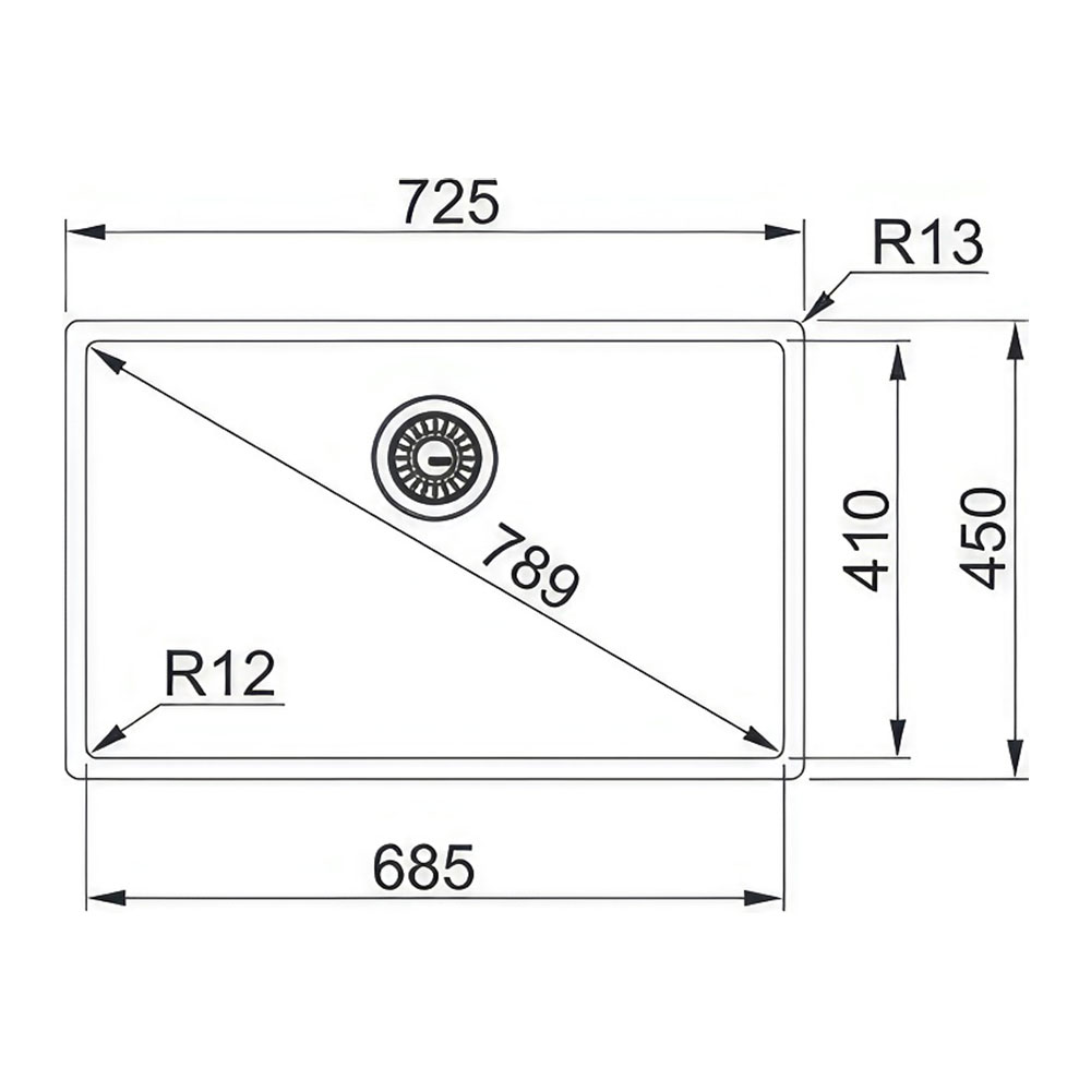 Bu tek hazneli evyenin dış ölçüleri sağdan sola 725 mm ve önden arkaya 450 mm'dir. Hazne boyutları sağdan sola 680 mm, önden arkaya 410 mm ve derinliği 200 mm'dir. Minimum alt dolap ölçüsü 80 cm gerektiren bu model, geniş mutfak alanları için idealdir ve birden fazla montaj seçeneği sunar.