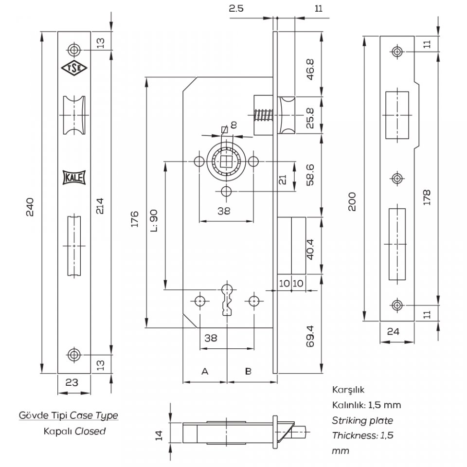 - Sürgü : Zamak döküm. Pirinç kaplamalı. İki turlu.