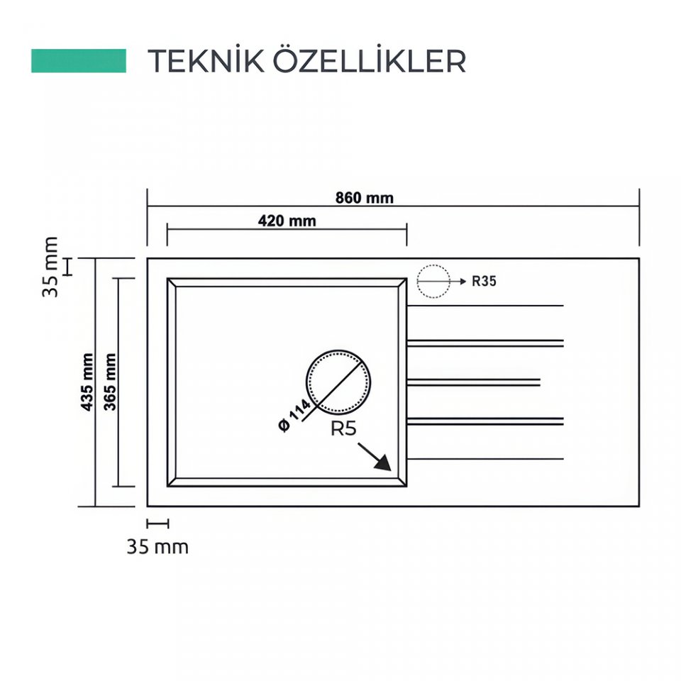 - Tezgaha Sıfır Kesim Ölçüsü: 860x435