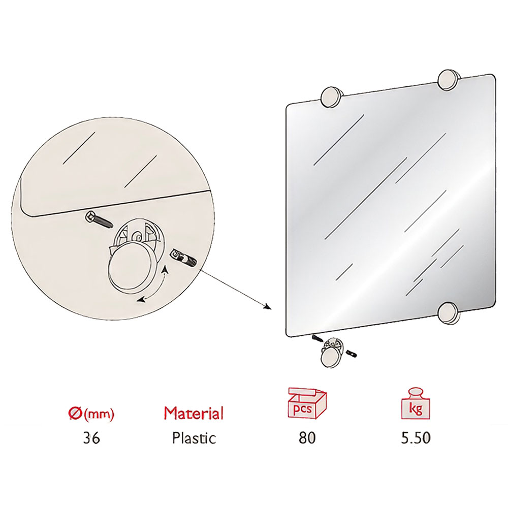 Ayna montajı için güvenli ve pratik bir çözüm sunan Ayna Tutucu, Ø36 mm Plastik Beyaz, modern ve şık tasarımıyla mekanlarınıza estetik katarken aynalarınızı sağlam bir şekilde monte etmenize yardımcı olur. Plastik malzemeden üretilmiş bu ürün, hafif yapısına rağmen 5,50 kg taşıma kapasitesiyle dayanıklılığı ön planda tutar.